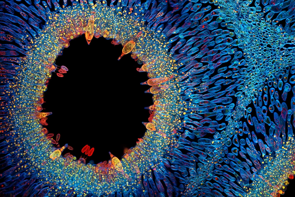 This yawning abyss surrounded by colorful ovals is a cross section through the spore-bearing part of a fungus that’s a cousin of the famous (at least in culinary circles) porcini mushroom.