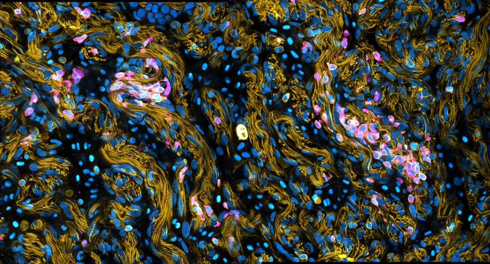 This is a fluorescently labeled image of cardiac tissue from the atrium of a zebrafish. The pink clusters are T cells (1). The golden strands are cardiac muscle tissue (2). The blue ovals are the nuclei of all the surrounding cells (3).