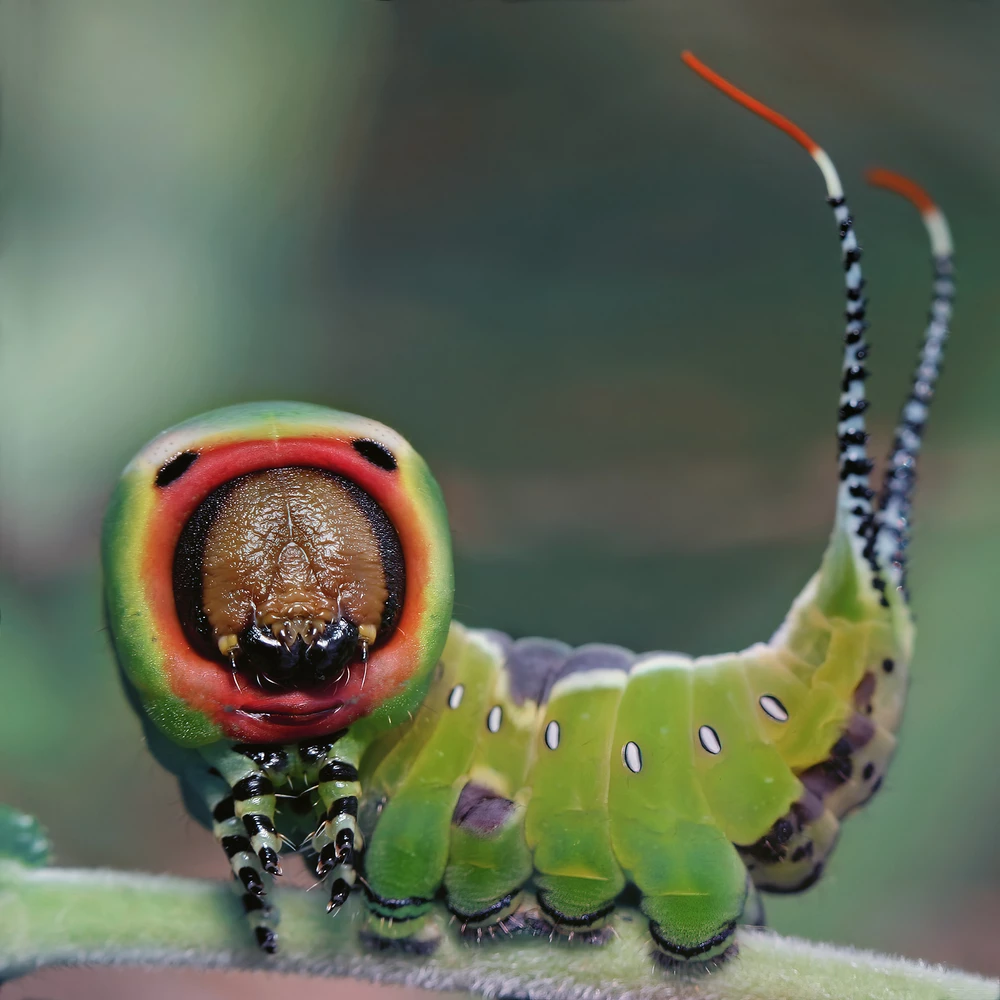 The long red flagellae on their forked tails serve to distract predators, warning them off or confusing them so that they attack the tail instead of the body. If this does not work, the caterpillar has a formidable secondary defense – it can spray its attacker with a mist of formic acid from a gland below its head as a scare tactic.