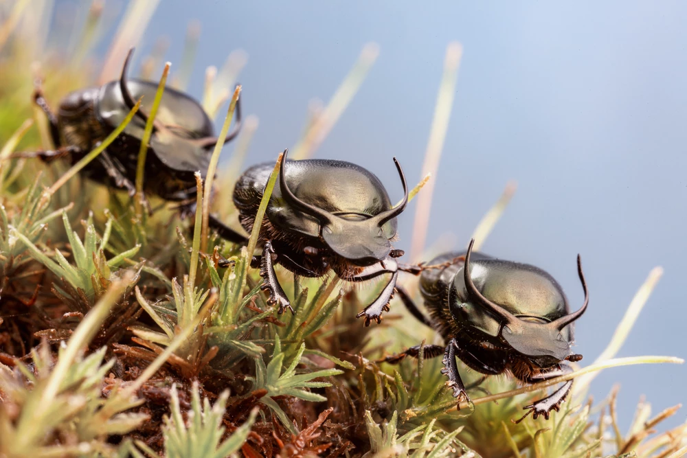 These dung beetles bring home balls of dung for food. The three small males pictured here each have a pair of long horns so they can go head-to-head when competing for females. Because dung beetles feed on manure, they are valuable for cleaning pastures.