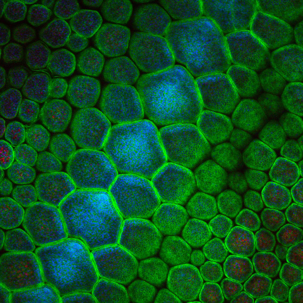 This is a fluorescent microscopy image of an embryonic chameleon’s skin, with individual cells distinguishable within the scales. The nuclei of these cells are blue (1). The actin protein within the cytoskeletons of the cells is stained green (2). And the red dots are nerve cells (3).