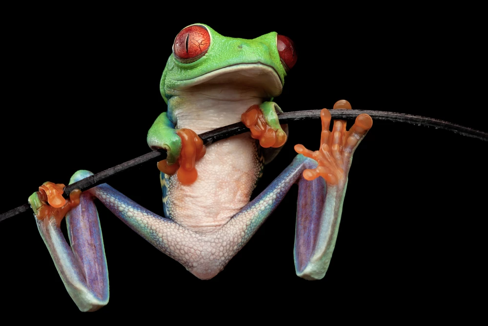 The red-eyed tree frog is native to Central America and northwestern South America. They breed readily in captivity and are often kept as pets. They are nocturnal predators who mainly hunt insects. Their large eyes allow them to see very well in low light and to track motion in the darkness.