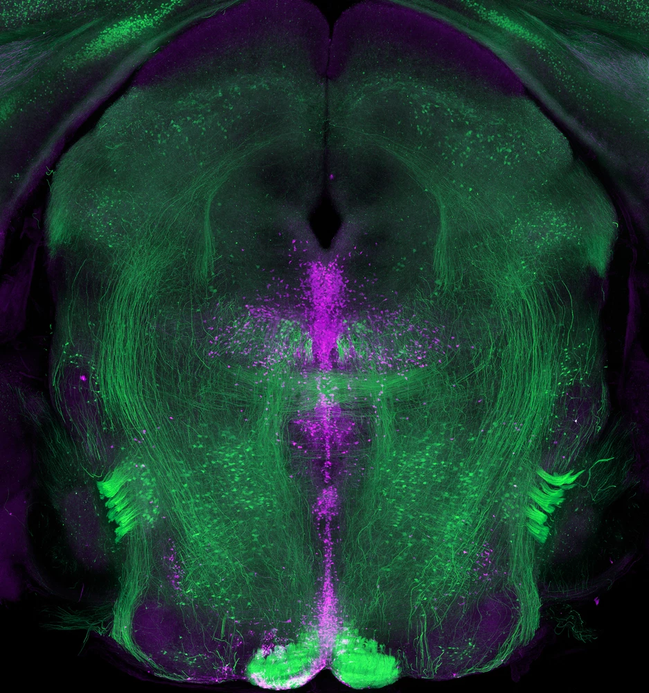 This image shows a 1.5-millimeter-thick coronal slice (from top to bottom) through the brain of a mouse, with neurons that produce serotonin (1 and 4) labeled in purple and pyramidal neurons (2) labeled in green. These clusters of serotonin-producing neurons (also known as serotonergic neurons) are located in an area of the brain called the raphe nucleus, just below the cerebral aqueduct (3), a fluid-filled canal in the midbrain.