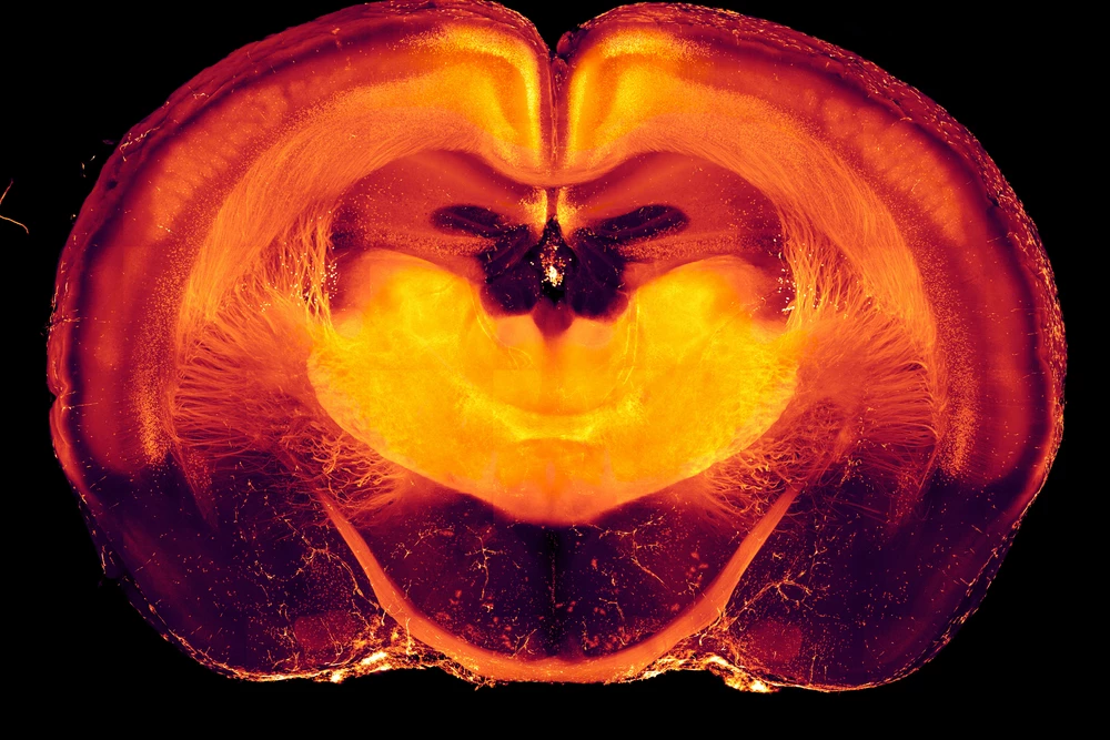 Have you ever been transported on a big orange school bus? In this image as well, orange is the color of transportation. Here, serotonin transporter proteins in the brain of a mouse are shown in orange. These proteins do exactly what their name implies – transport the neurotransmitter serotonin across the cell membrane.