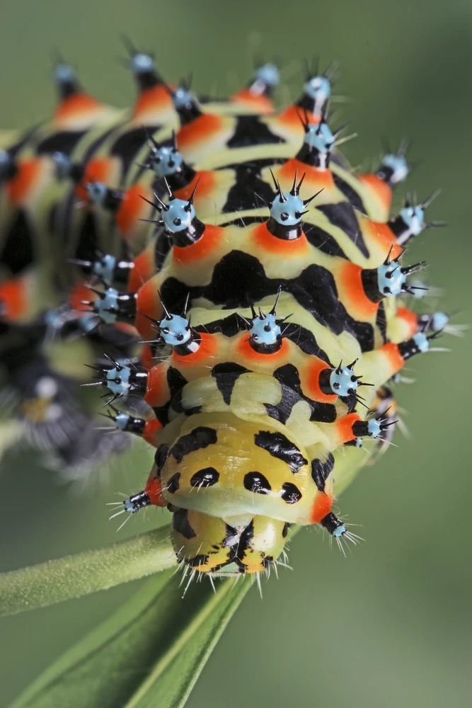 These caterpillars show aposematic coloration (a dramatic pattern to warn off predators) – in this case, wavy black and green markings with red accents and spiky blue tubercles. When they’re disturbed, these caterpillars secrete defensive chemical protection – a milky white, mildly toxic solution – from their tubercles.