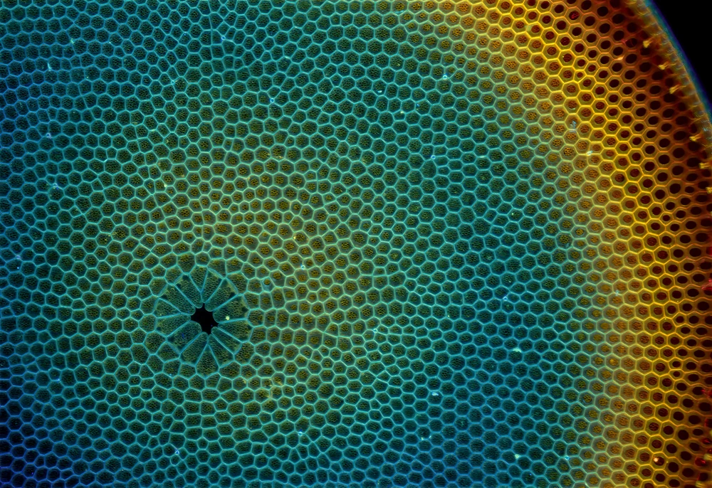 The radiating, kaleidoscopic pattern you see here was once the living glass skeleton – the cell wall – of a single-celled organism called a diatom. These organisms absorb silicon from their environment and transform it into silicon dioxide, the same substance glass is made of, to form their cell walls.