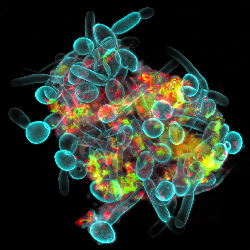 This is a cluster of Candida albicans fungus in blue (1) and Streptococcus mutans bacteria in green (2) from a sample of human saliva. You can also see bacteria-derived extracellular polymers known as alpha-glucans in red (3).