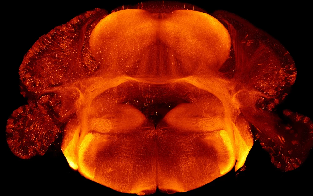 This image shows a 1-millimeter-thick slice through the brain of a mouse, with neurons expressing a gene that codes for an enzyme called kallikrein-related peptidase 8 labeled in orange. You can see random and asymmetrical clumps of these cells (1 and 2), suggesting that this gene is expressed randomly throughout certain parts of the brain during development.