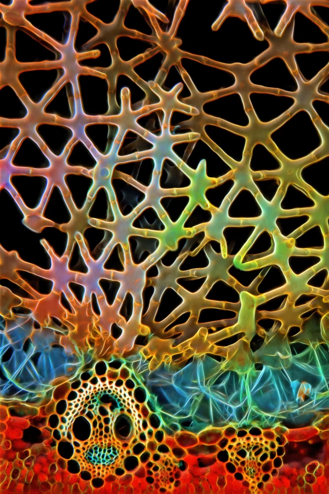 How does air reach submerged parts of plants that grow in or around bodies of fresh water? This cross section through the leaf of a rush plant shows the irregular structure of its star-shaped cells – which makes all the difference.