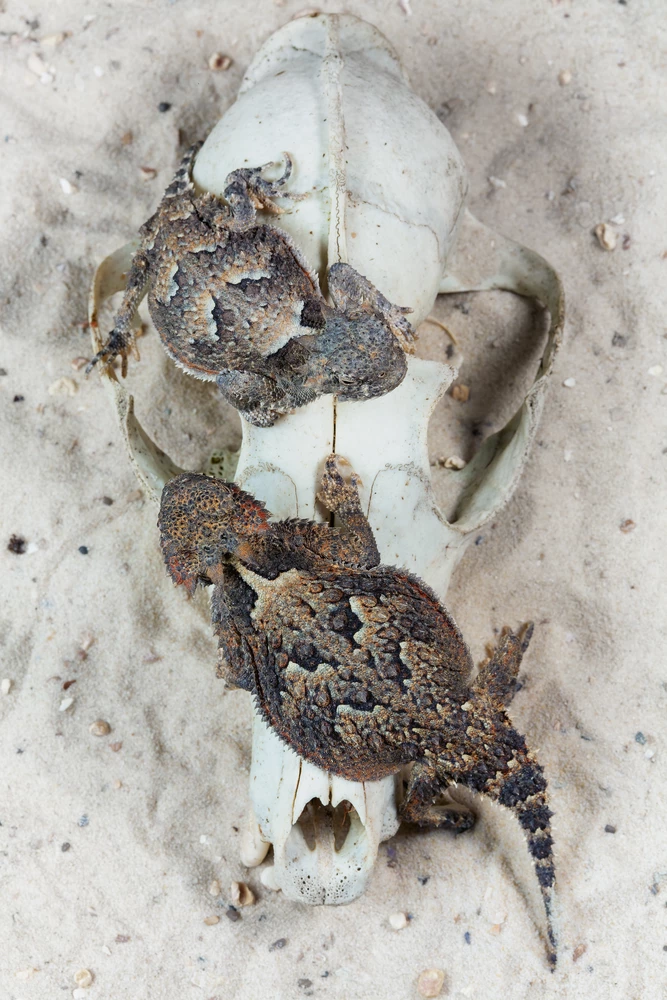 These horny toad lizards may have “toad” in their name, but they’re lizards, not toads. The horns around their heads and their spiked scales give them their name.