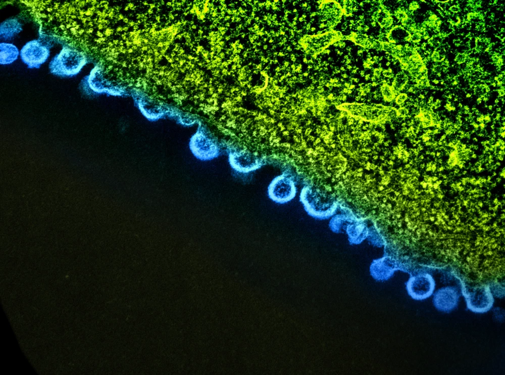 This transmission electron microscopy image shows HIV viral particles (yellow) near the end of the budding process; the cell they’ve infected is in blue.