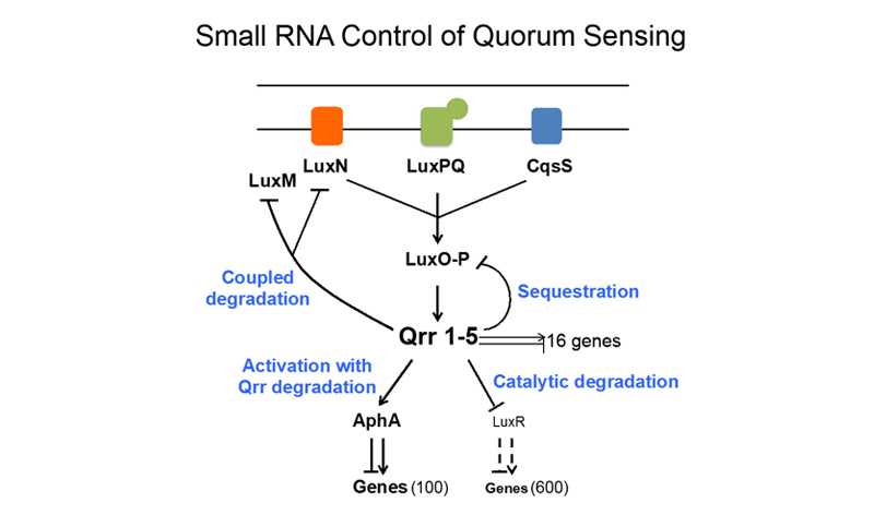 Although she first observed quorum sensing in a bioluminescent marine bacterium called Vibrio harveyi, Bassler has since shown that the communication system is used widely among diverse bacterial species. Species-specific and genera-specific molecules called autoinducers transmit the bacterial messages, and Bassler and her team have identified small RNAs and other molecules that help cells respond. The researchers also discovered that a molecule named AI-2 allows cross-species conversations, and that hundreds of bacterial species use the AI-2 molecule to communicate, suggesting the existence of a universal bacterial language.